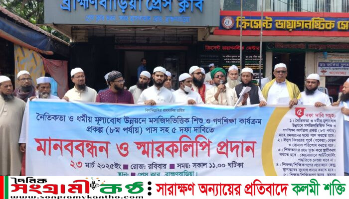 আউটসোর্সিং বাতিল করে প্রকল্প স্থায়ীকরণসহ ৫ দফা দাবিতে ব্রাহ্মণবাড়িয়ায় মউশিক শিক্ষক কল্যাণ পরিষদের মানববন্ধন ও স্মারকলিপি প্রদান।